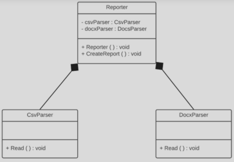 W tej wersji Reporter_bad tworzy instancje parserów (CsvParser_bad, DocsParser_bad) bezpośrednio w swoim konstruktorze.