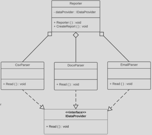 ZależnośćReporter_bad zależy bezpośrednio od konkretnych klas CsvParser_bad i DocsParser_bad.Reporter zależy od abstrakcji IDataProvider.