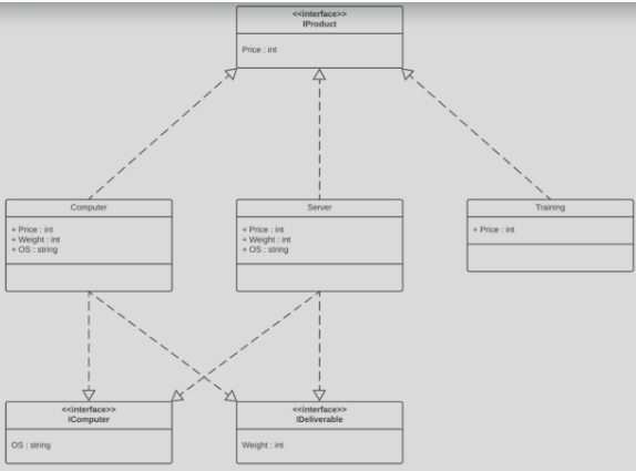 Dzięki temu podejściu klient (kod używający tych klas) może teraz zależeć tylko od potrzebnego mu interfejsu, np. funkcja obliczająca koszt dostawy będzie operować na IDeliverable, a system fakturowania na IProduct.
