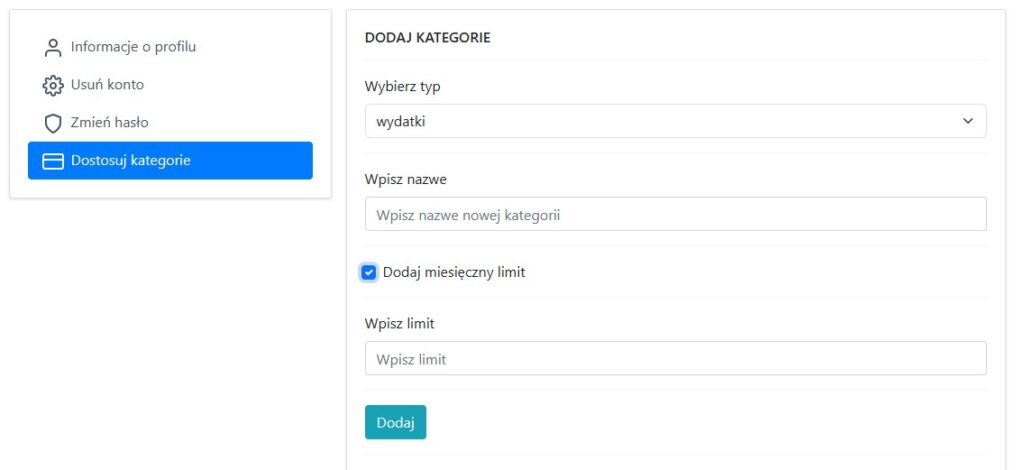 balance.jsgeneruje wykresy kołowe podsumowujące przychody i wydatki w podziale na kategorie. - Komunikacja AJAX: Wykorzystywana do przesyłania wybranego zakresu dat na stronie bilansu oraz do pobierania informacji o limitach kategorii podczas dodawania wydatku (