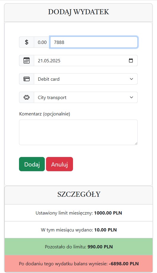 GET /api/limit/{id_kategorii}/date/{data}) zwracający dane o limicie dla kategorii wydatków oraz sumie dotychczasowych wydatków w danym miesiącu. Jest on wykorzystywany przez skryptoutcome.jsdo dynamicznego informowania użytkownika.