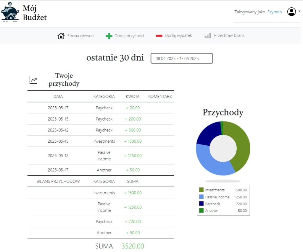“Mój Budżet” to aplikacja internetowa stworzona w języku PHP, która umożliwia użytkownikom kompleksowe zarządzanie finansami osobistymi. Aplikacja pozwala na rejestrowanie przychodów i wydatków, kategoryzowanie ich, a następnie analizowanie przepływów pieniężnych za pomocą czytelnych zestawień i wykresów. Dodatkowo, użytkownicy mogą definiować limity wydatków dla poszczególnych kategorii, co wspiera świadome planowanie budżetu.